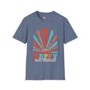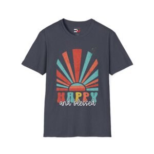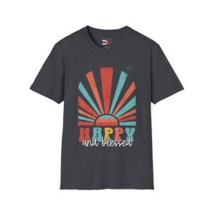 Happy and blessed, express your deep faith-based state of well-being rooted in your relationship with God with this cheerful retro sun graphic tee—not just fleeting emotions or material fortune but God’s favor, peace, and joy—especially in the midst of hardship.   It’s a declaration of spiritual richness, not just worldly comfort   Wear & share this key to life today.