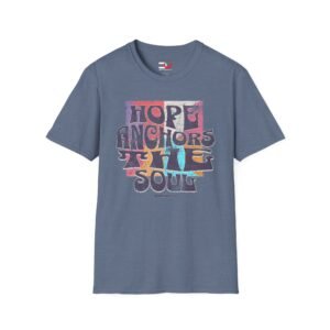 Hope Anchors the Soul Summer Retro Graphic Tee.  Just like an anchor holds a ship steady in stormy seas, this Divine hope grounds the believer’s soul.  A fun, colorful, retro graphic design from Hebrews 6:19.  Soft, semi-fitted, preshrunk cotton tee.