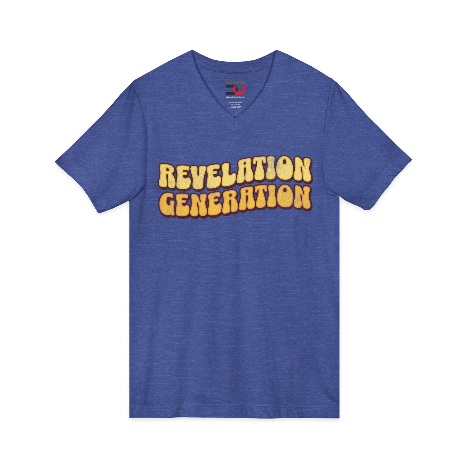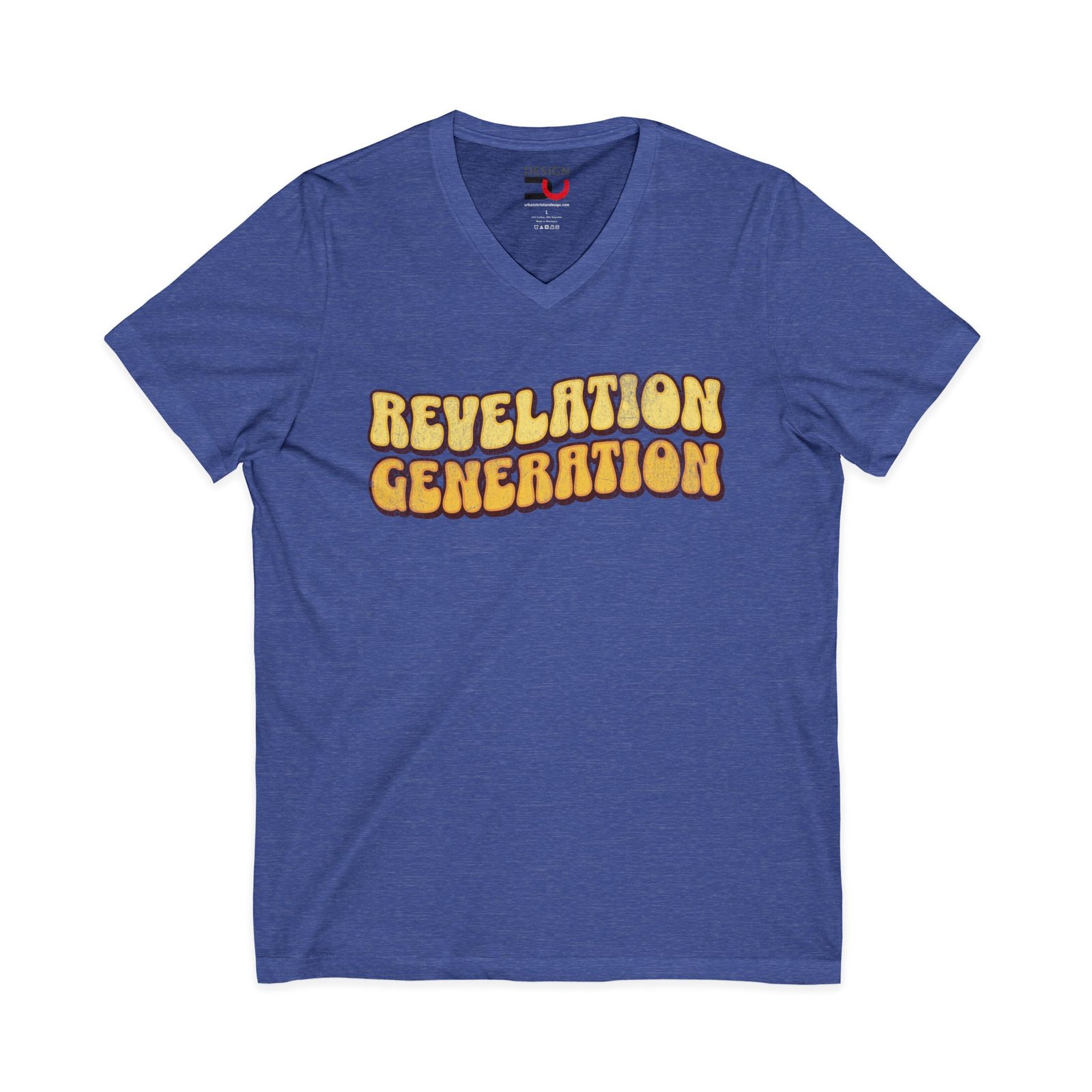 The current generation, believed to be living in the end times, based on signs in the world today are witnessing the fulfillment of biblical prophecies in the Book of Revelation. So before it’s too late, wear and share the Revelation Generation V-neck Tee.  A generation called to understand, prepare for, or embody the final unfolding of God’s redemptive plan