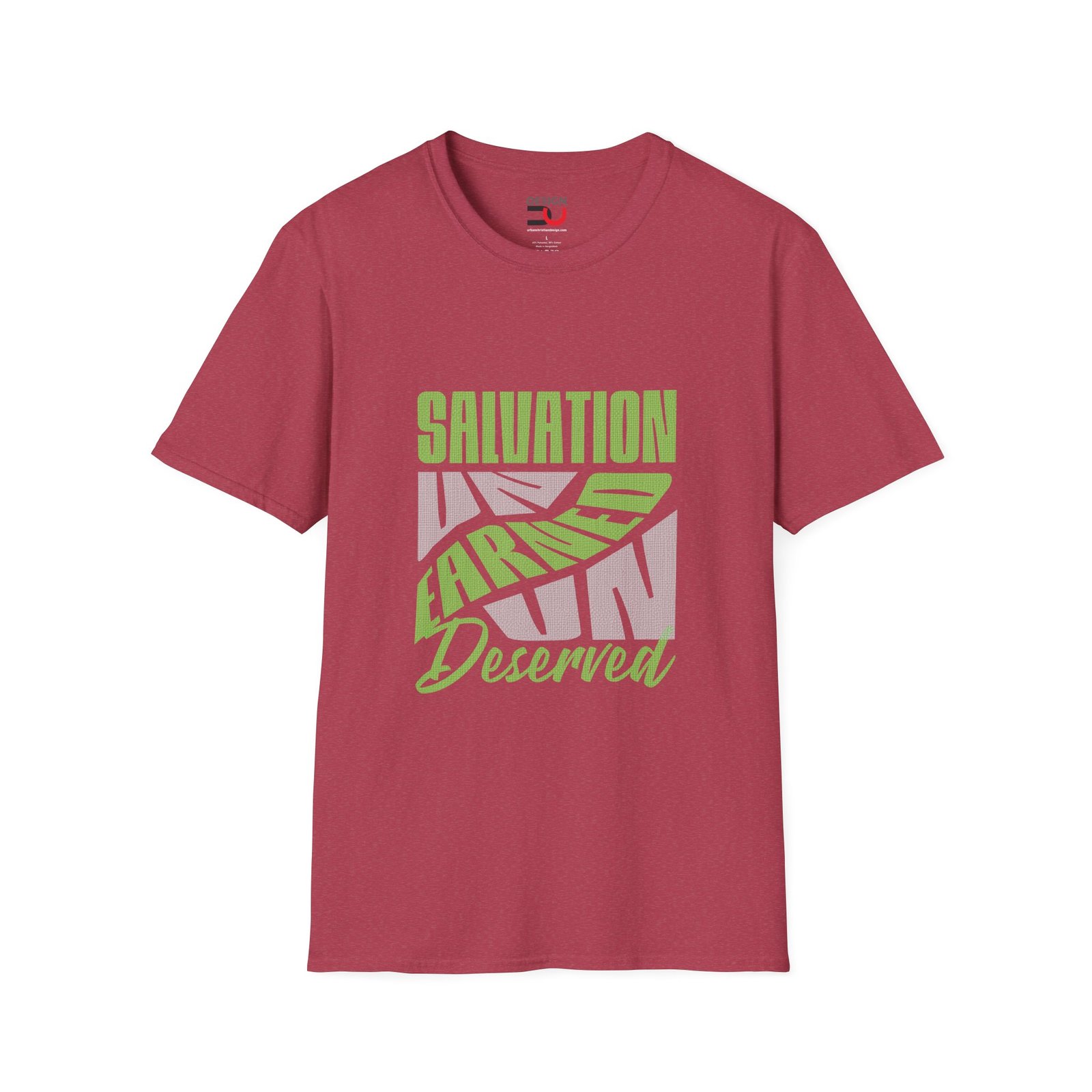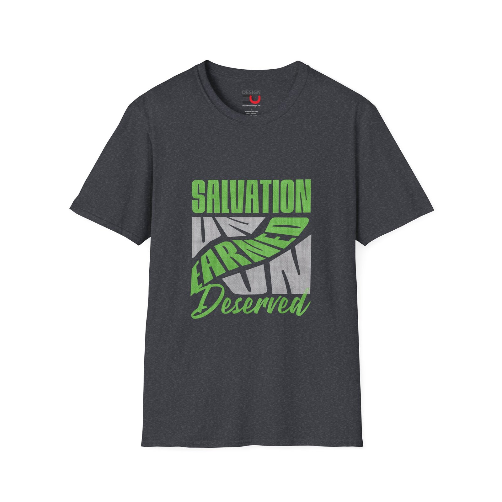 Salvation is a gift from God that is not based on any merit, effort, or worthiness on the part of the individual.  It calls for calls for humility, gratitude, and a response of faith, rather than self-righteousness.  That’s a powerful message in such a neat graphic on a soft, smooth, lightweight, semi-fitted, ring-spun cotton T- shirt.